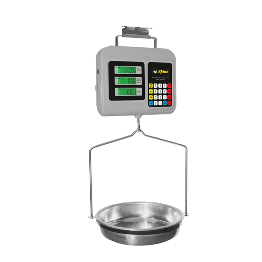 Báscula electrónica colgante RHINO modelo BACMU-30 con capacidad de 30 kg y precisión de 5 g. Incluye funciones de caja registradora, doble pantalla iluminada (usuario y cliente), plato de acero inoxidable y batería recargable con hasta 200 horas de autonomía.