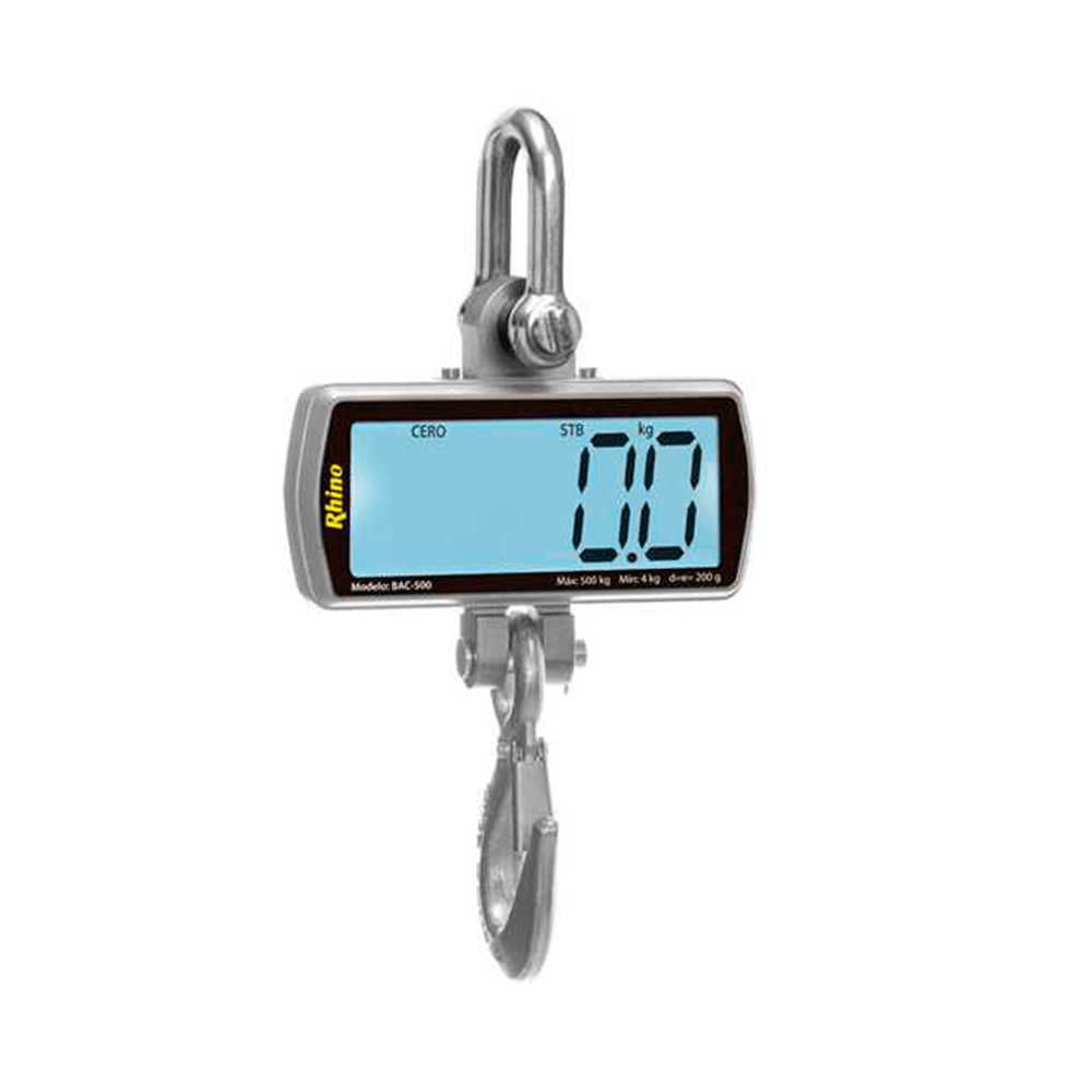 La báscula colgante RHINO BAC-500 combina precisión, facilidad de lectura y operación a distancia. Soporta hasta 500 kg con una precisión de 200 g, e incluye control remoto con alcance de hasta 20 metros.