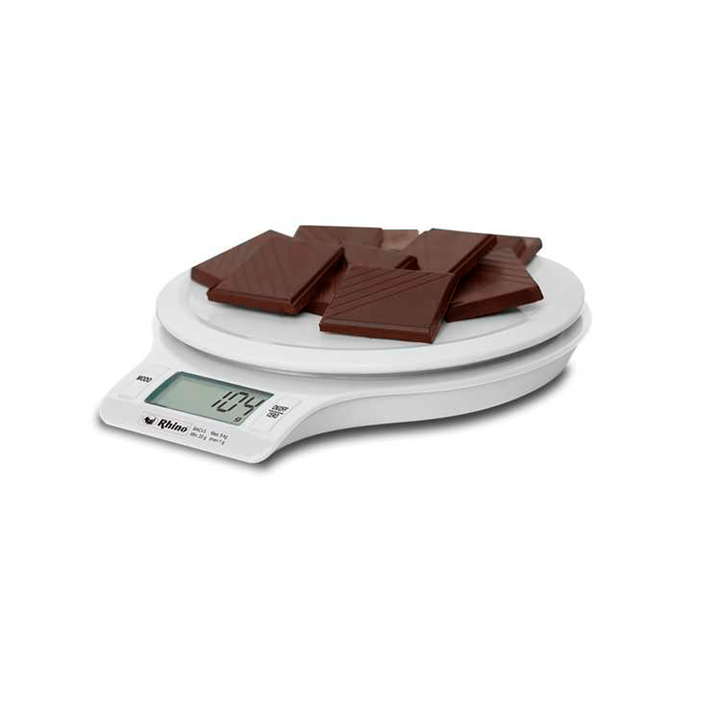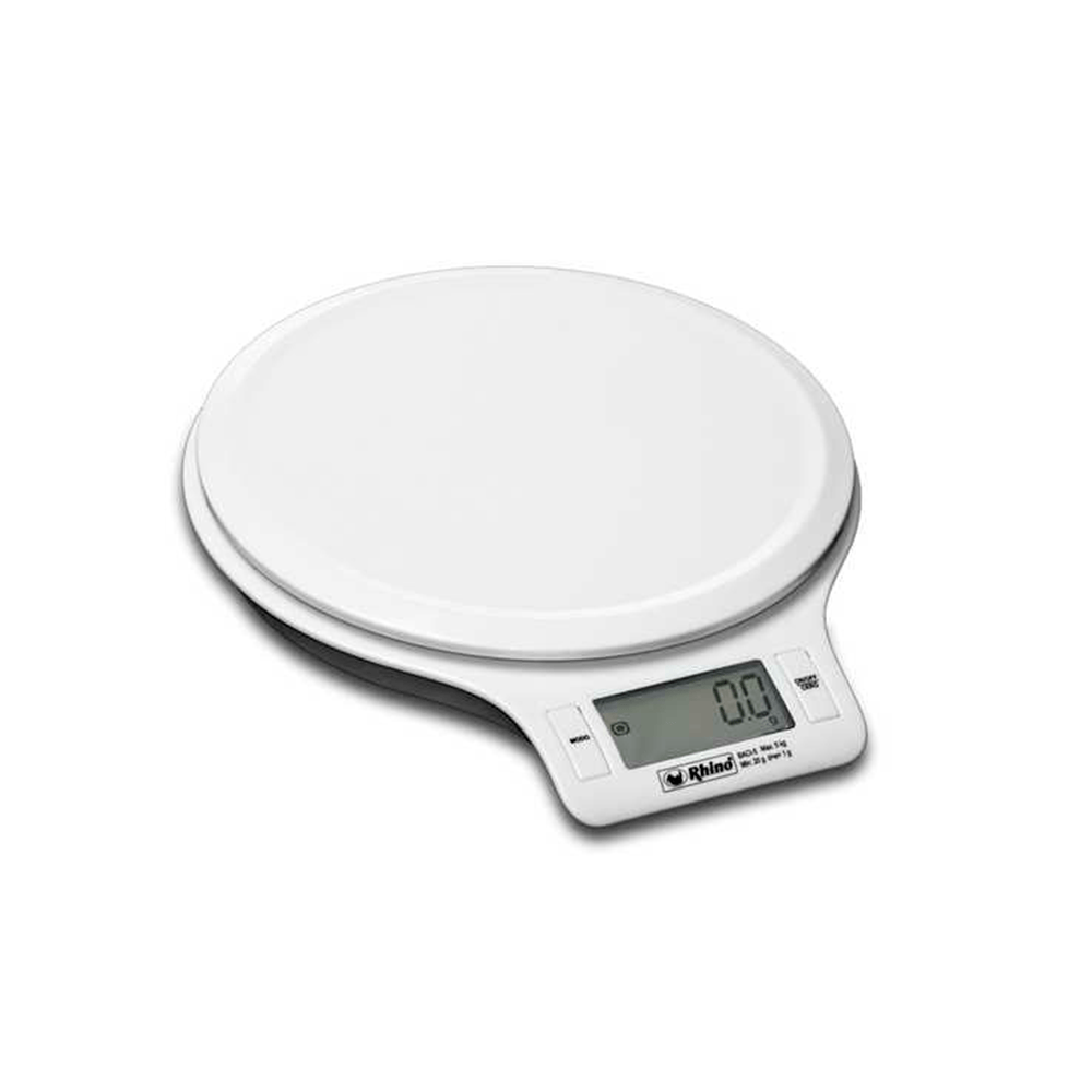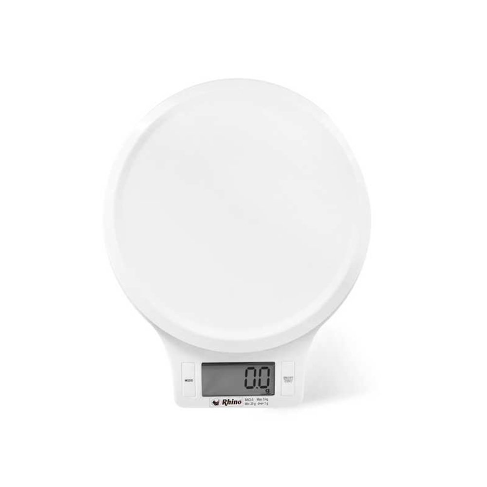 Báscula de cocina RHINO BACI-5 con capacidad de 5 kg y precisión de 1 g. Incluye función para calcular volumen en líquidos y alimentos, plato circular antiderrames de 17 cm, y operación con baterías AAA. Ideal para recetas precisas y uso doméstico.