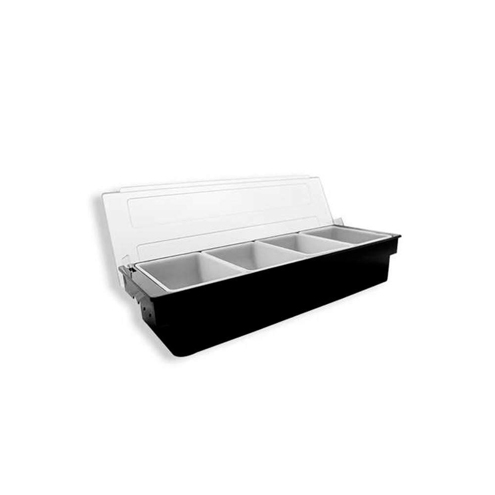 Caja para condimentos modelo CACO-4 con 4 compartimentos extraíbles. Fabricada en plástico ABS, PS y PP de alta resistencia, con tapa de acrílico transparente. Ideal para uso profesional en barras de servicio, estaciones de coctelería o preparación de alimentos. Certificación NSF.