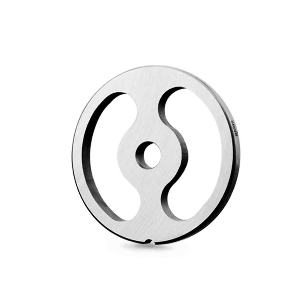 Cedazo riñonero CEDA12-2K para molino de carne No. 12 con dos barrenos. Especial para embutido sin molido. Fabricado en acero de larga duración.