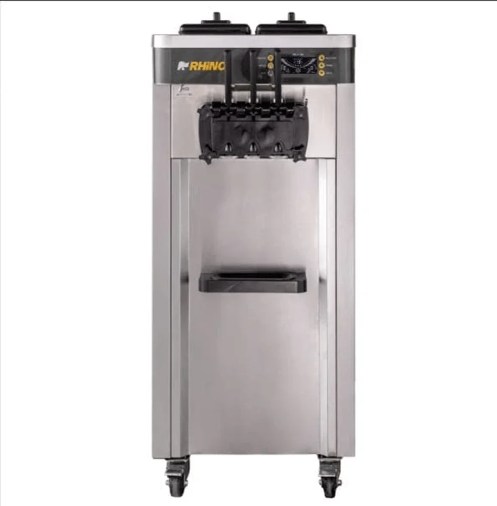 Máquina de helado suave Rhino HELA-25P con capacidad de 25 litros por hora. Equipada con tres dispensadores (dos sabores y uno combinado), panel digital y llantas con freno para fácil transporte. Ideal para negocios con alta demanda de helado.