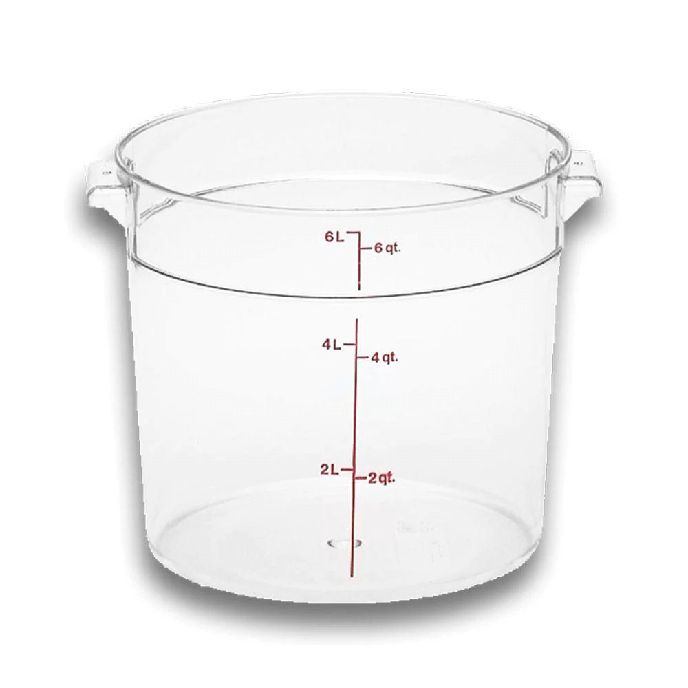 Recipiente redondo modelo REPORE-6 fabricado en policarbonato transparente de alta resistencia. Capacidad de 6 qt (5.68 L). Graduado en litros y cuartos. Apto para lavavajillas y libre de BPA.